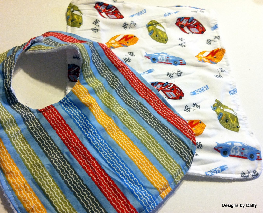 High Quality Bibs and Burp Cloths Various Fabrics on one side with high quality terry cloth on the back side of both the burp cloth and the bibs.