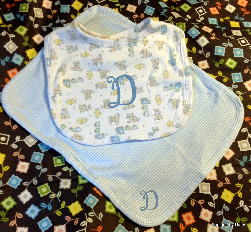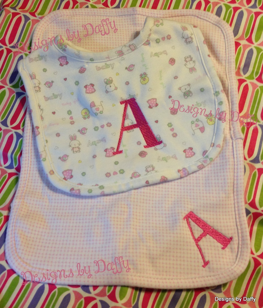 This adorable pink bib and burp cloth set comes with baby's initial on it in a cute microfiber zippered clutch. Set is made with a premium cotton interlock. Burp Cloth backed in the same fabric, bibs have a soft terry cloth backing.