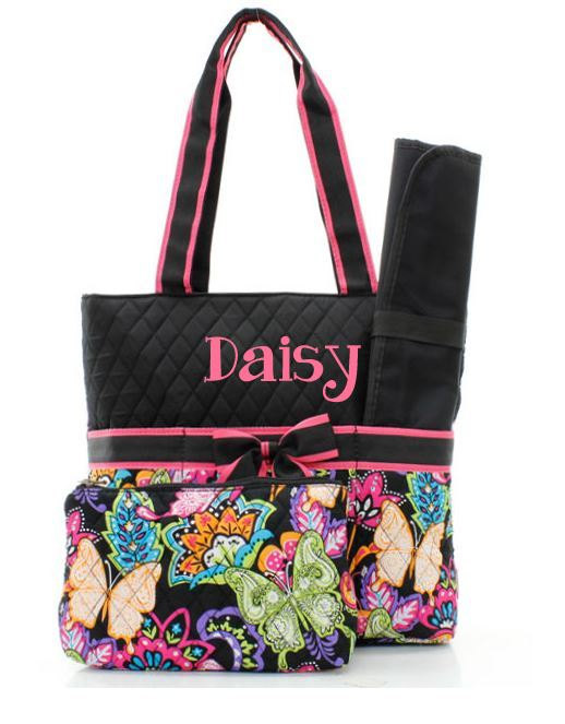 This brand new design is absolutely adorable!!!! This three piece Diaper Bag would be very convenient! There is a baby changing pad and mini zipper case that is included. The set is highly practical and trendy. Quality quilted diaper bag customized with first name, initial or monogram.