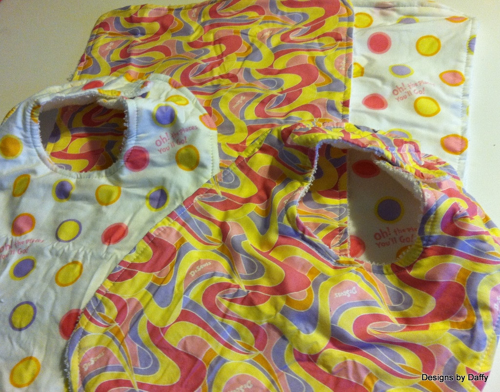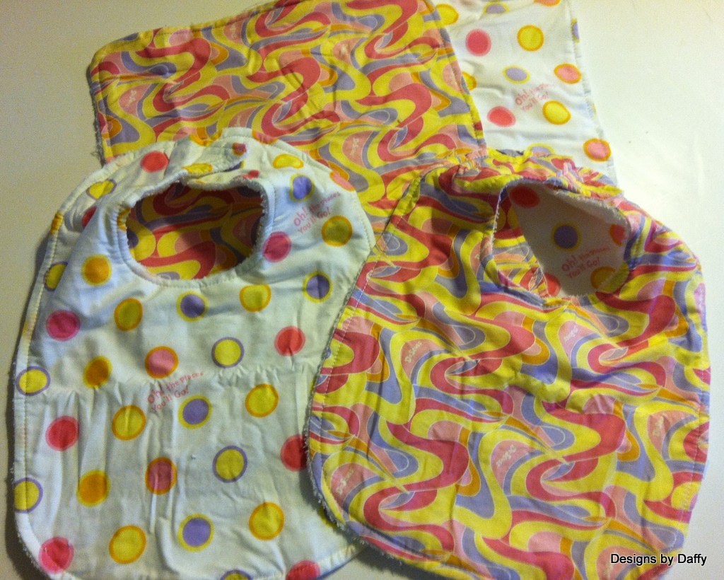 High Quality Bibs and Burp Cloths Various Fabrics on one side with high quality terry cloth on the back side of both the burp cloth and the bibs.
