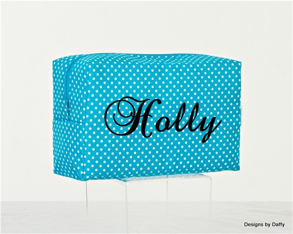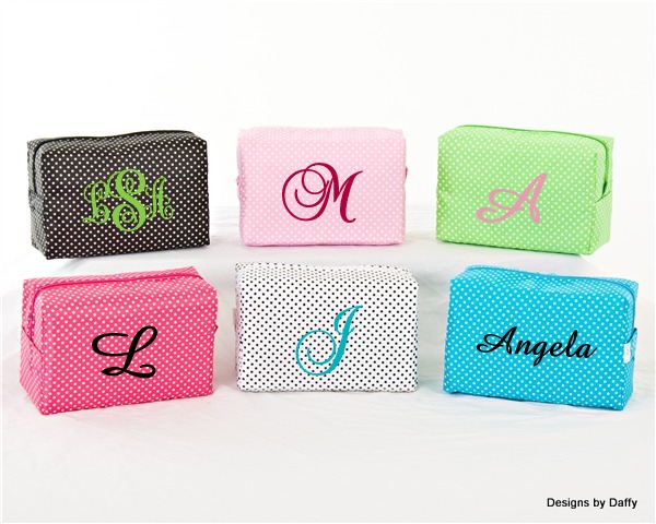 Free personalization with name or initials. You choose the font type & color of thread. The zippered top keeps everything organized. The inside is lined with a protective layer of plastic to keep everything dry and tidy. These make beautiful bridesmaid gifts! Perfect for a spa visit, travel, or the gym.