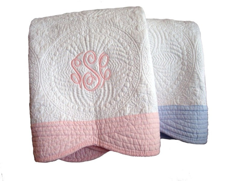 Sure to become one your most treasured family heirlooms, our monogrammed cotton batiste baby quilts make a superb welcoming gift for the new baby! Can be used as a wall hanging, palette, bed cover, etc.