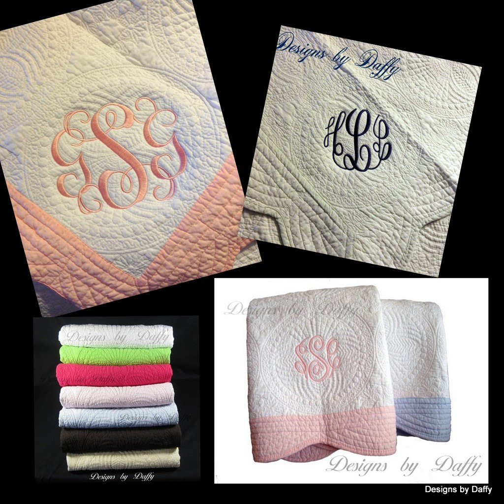 Monogramming Styles and font options are as pictured. If there is something you've seen that you would like to have just send me a picture and I'll be glad to see if it's something I can accommodate. Price includes a large monogram in the center of the quilt or diagonal in the bottom corner. A large center monogram is approximately 6 - 7 inches in diameter. Birth details may be added if desired. If additional statistics are desired to be included, additional charges apply. Email me with your request to obtain pricing.