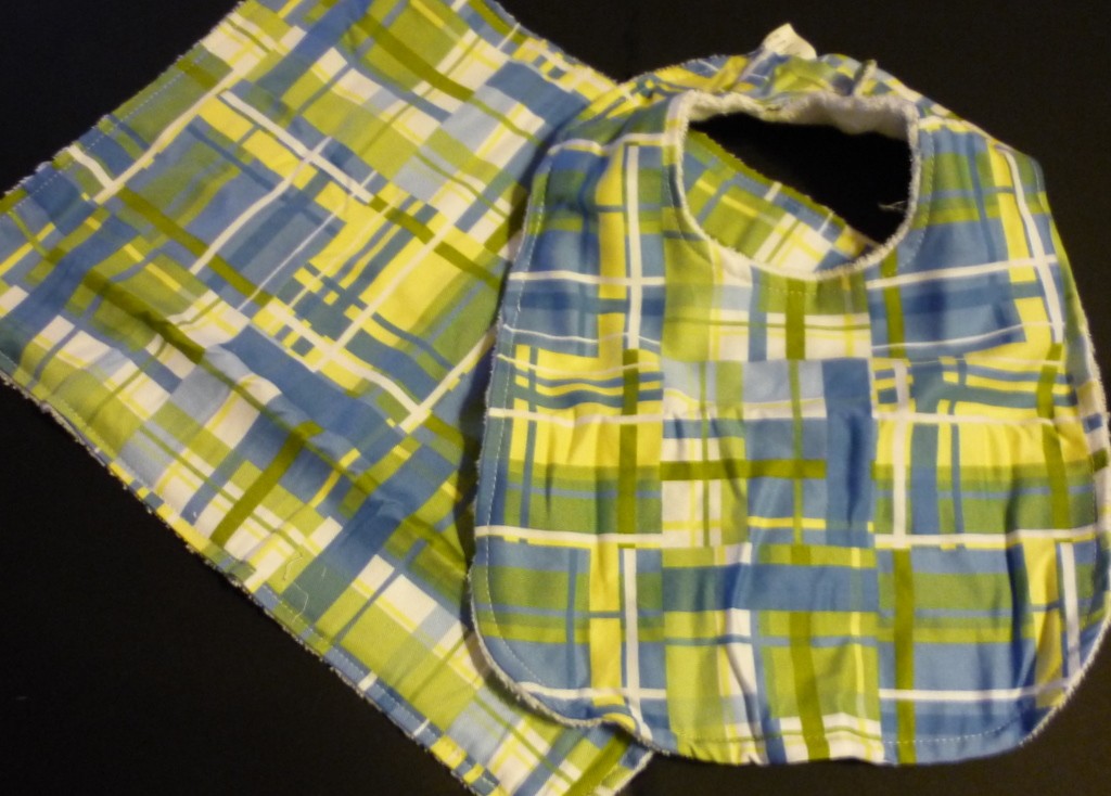 High Quality Bibs and Burp Cloths Various Fabrics on one side with high quality terry cloth on the back side of both the burp cloth and the bibs.