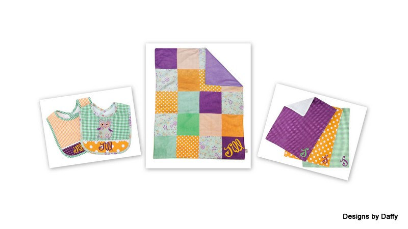 This adorable personalized coordinating quilt, bib and burp cloth set is a super nice set for your own little one or to give as a gift to the new mom!