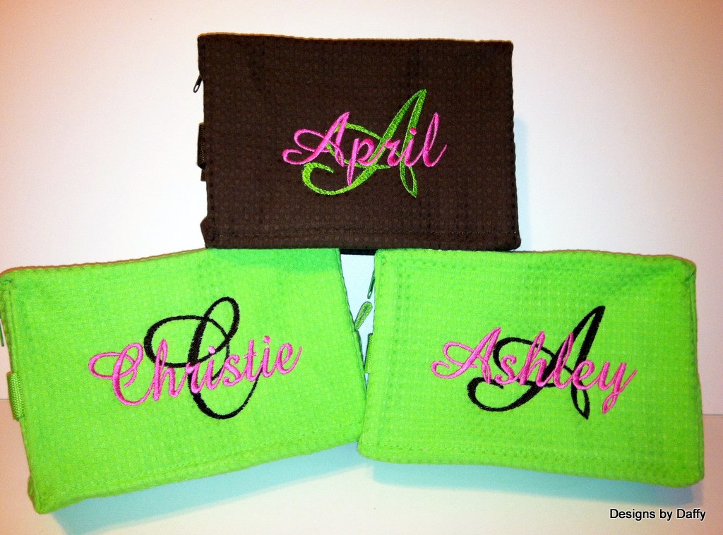 Free personalization with name or initials. You choose the font type & color of thread. The zippered top keeps everything organized. The inside is lined with a protective layer of plastic to keep everything dry and tidy. Optional coordinating bows available by request. These make beautiful bridesmaid gifts! Perfect for a spa visit, travel, or the gym.