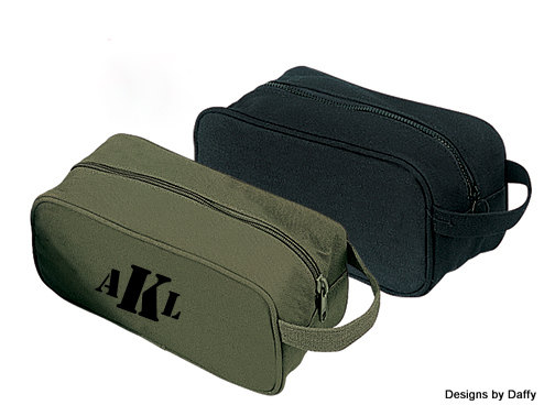 Personalized heavy weight canvas toiletry bags available in black or olive drab. Embroidered with your choice of monogram or initial. Perfect gift for any guy, military quality and weight and very durable. Available in Black or Olive Drab. Great Groomsmen gifts!